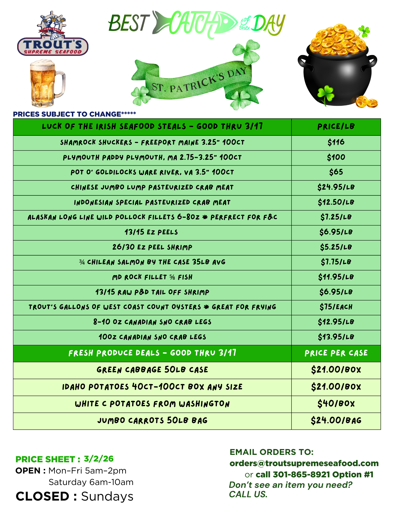 Availability depends on seasonal crab runs and weather. Please call for daily updates.